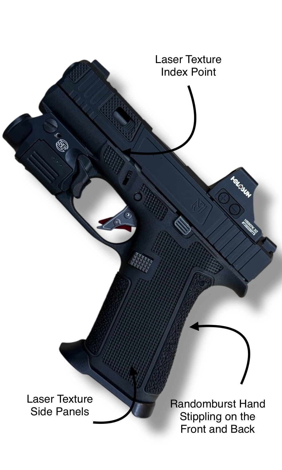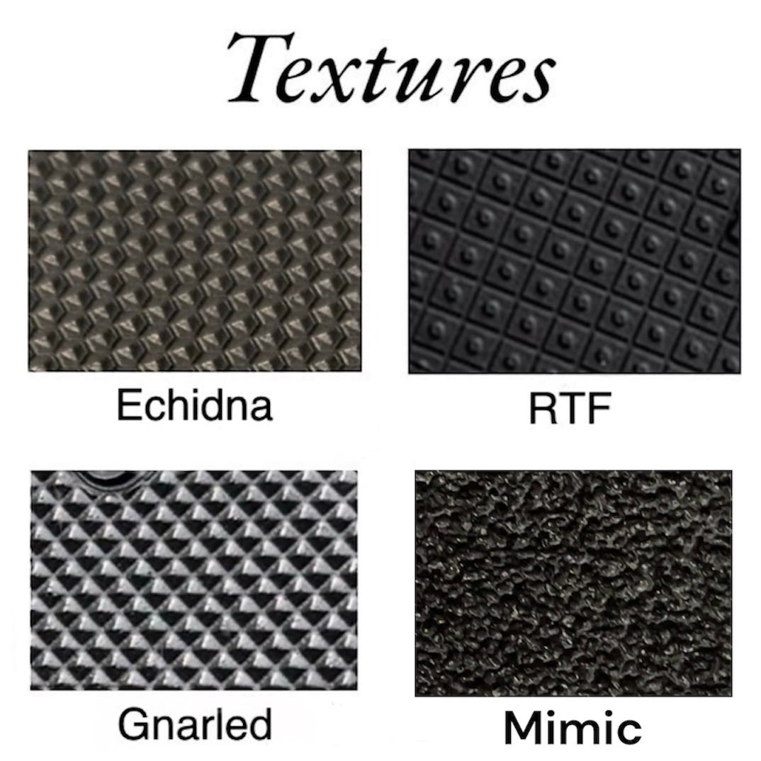 Choose between our signature Echidna 3D or Gnarled 3D textures for an aggressive, no-slip grip that enhances weapon control in any condition. Another great option is our new Mimic texture, which is a more carry friendly laser texture while still maintaining the same great randomburst hand stipple on the front and backstrap.