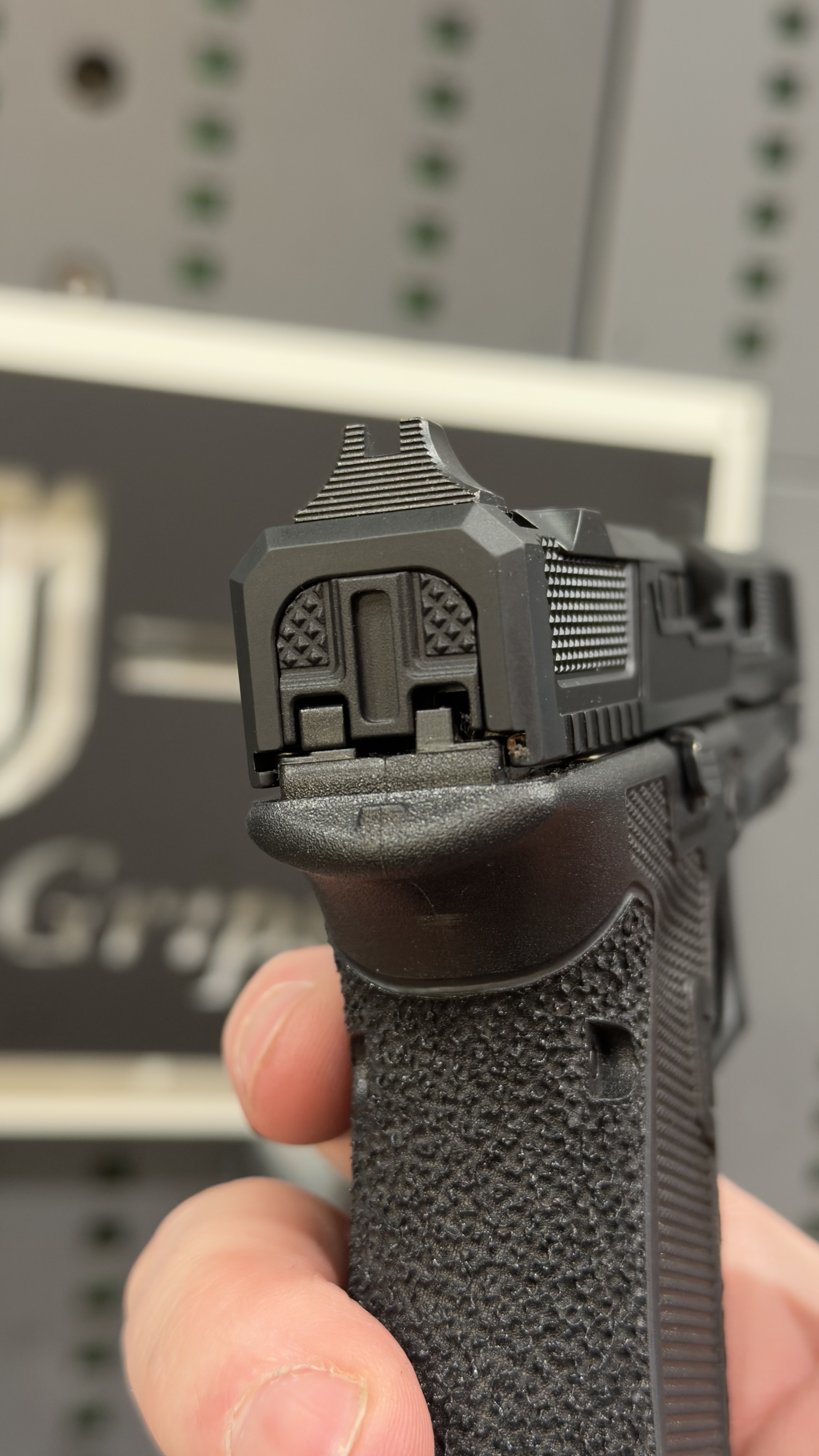 Ditch the cheap OEM plastic backplate and replace it with our knurled version, cut from aluminum and finished in black Cerakote. The subtle knurling adds clean detail to the rear of the slide and gives it a more solid, finished appearance.