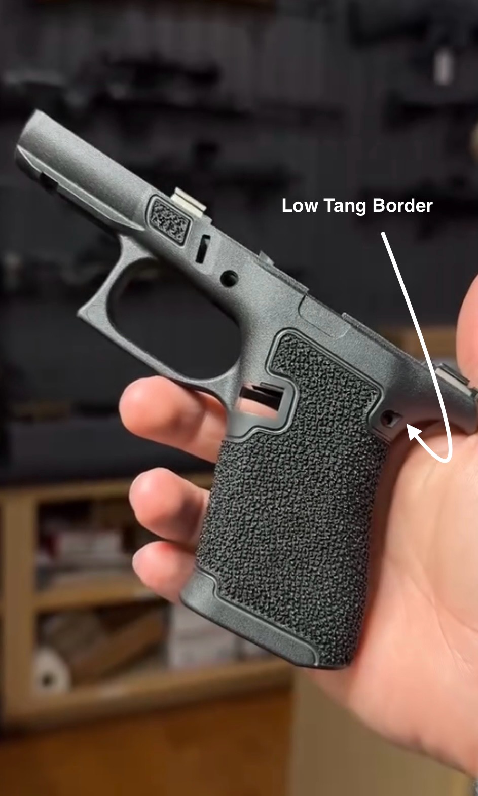 Adds an additional relief cut below the trigger guard for the support hand, improving two-handed grip engagement and control under recoil.